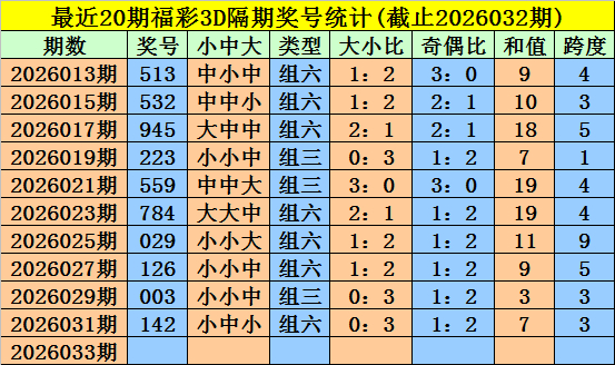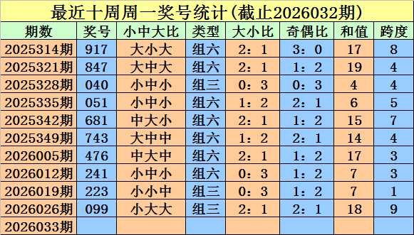 奖号类型判断:近期周一组六明显活跃,近十周开出7次,当前轮空2周,组三出现较少,本周一看好在组六。