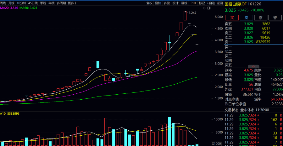 “白银今年涨得实在是太猛了,盘中一度涨幅超过6成,1月底忍不住追高了场内的国投白银LOF基金,前两天还高兴,但是这几天要哭了,天天跌停,从现在的抛压来看,短时间内估计跌停板难以打开。”广州的一名投资人罗女士向记者抱怨。