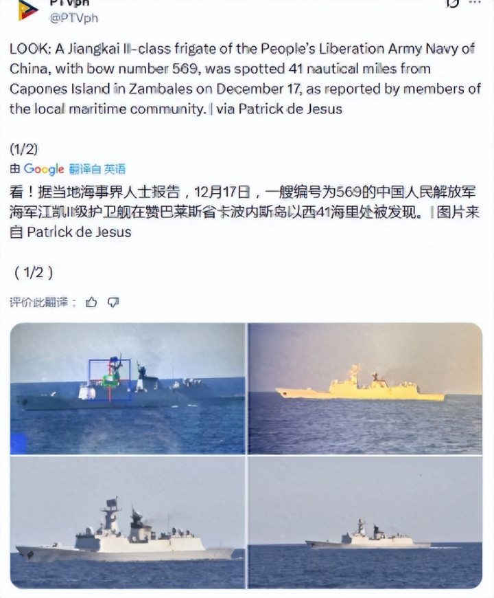 近日,菲律宾海军对外发布照片,证实中国海军的054A护卫舰“玉林舰”(舷号569)于本月17日抵达距吕宋岛三宝颜西南约41海里的海域进行了巡逻。